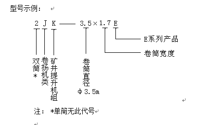 本產(chǎn)品執(zhí)行中華人民共和國(guó)機(jī)械工業(yè)部標(biāo)準(zhǔn)JB/T2646-1992《單繩纏繞式礦井提升機(jī)型式基本參數(shù)與尺寸》,其型號(hào)表示方法符合中華人民共和國(guó)機(jī)械工業(yè)部JB1604—1998《礦山機(jī)械產(chǎn)品型號(hào)編制方法》的規(guī)定。